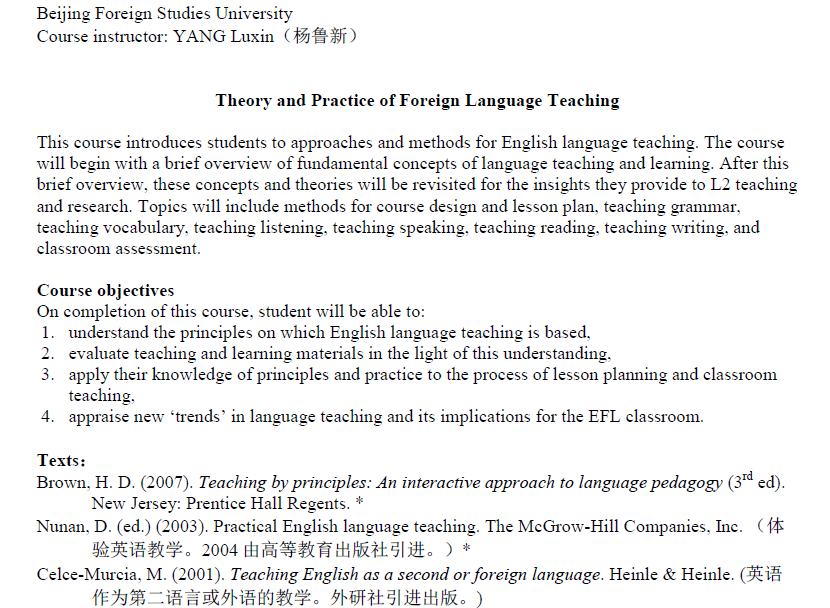 1. 掌握外语教学中语法、词汇、听力、口语、阅读、写作等教学活动所遵循的语言学习规律、教学原则及研究方法
